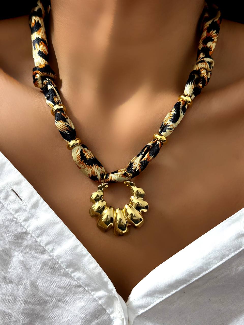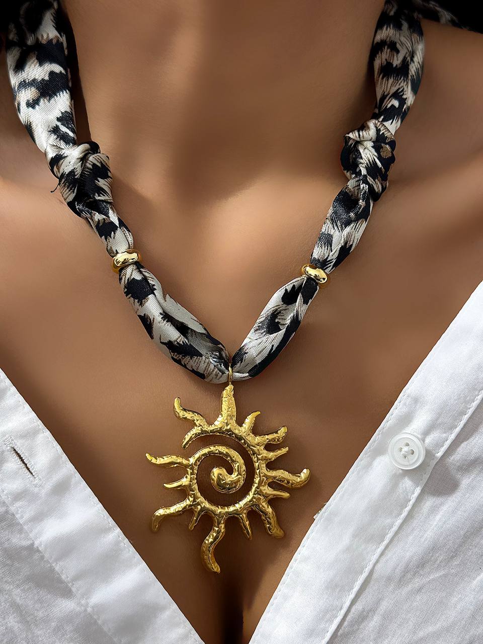 گردنبند پارچه ای پلنگی با پلاک خورشید استیل طلایی