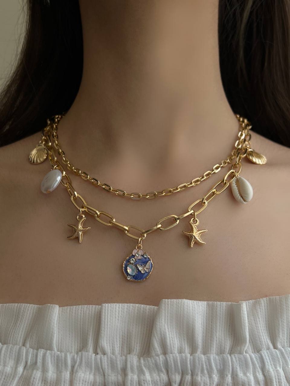 گردنبند دو لاین صدف و ستاره دریایی طلایی